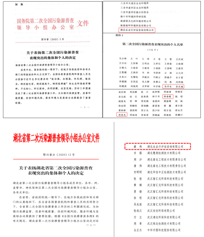 全国第二次污染源普查(以下简称“二污普”)是一项调查重大国情省情的基础工作,是推进生态环境保护的重要举措。自2017年开始,永业行“二污普”永业行承接了湖北省武汉市、荆州市、襄阳市、咸宁市、恩施州等18县(市、区);海南省三亚市、文昌市等6市县区普查工作。其中参与入户7个,参与质量评估17个,合计24个地区。团队历时三年,以专业的技术服务,高质量完成普查工作,为加强污染源监管、改善环境质量、防控环境风险、服务环境与发展综合决策提供了重要依据,获得上级普查机构的认可,受到国家、省市普查办发文表扬,服务的市县更是获得国家和省多项表现突出集体和个人的表扬。